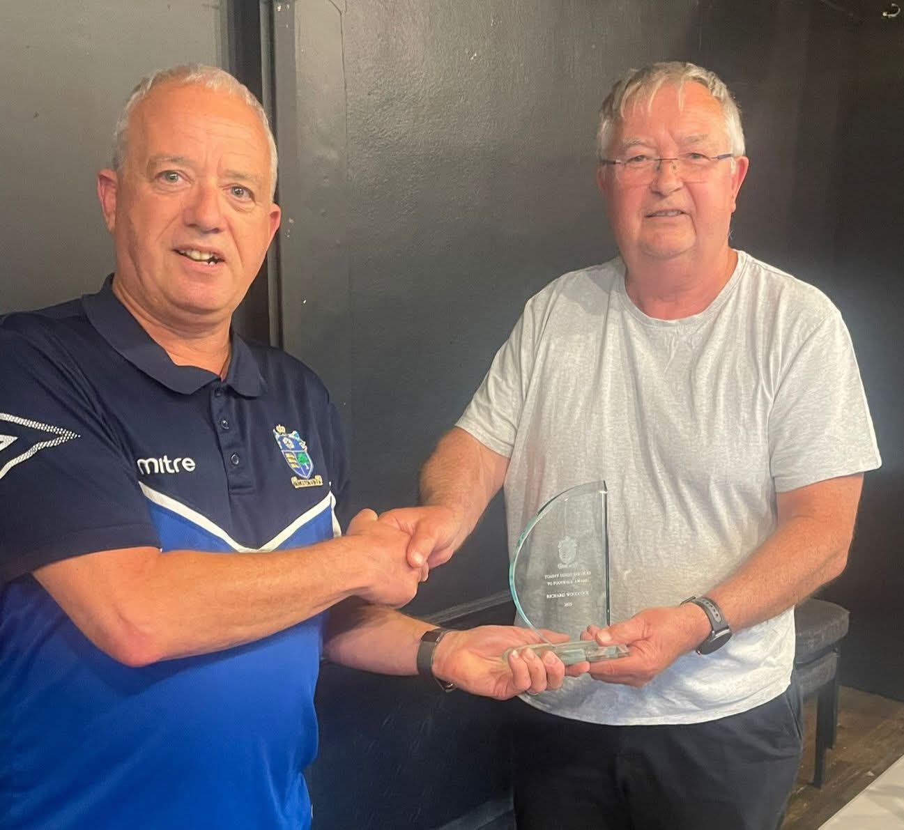 Barkston Ash District FA secretary Brian Coutts presented the Tommy Dixon Services to Football to Richard Woodcock for his many years service to both Bramham and Tadcaster Magnets.