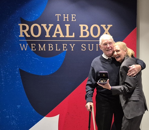 Ivor Reed, Barkston Ash Council member picks up 75year FA Award from FA Chair Debbie Hewitt MBE. Ivor was invited down to Wembley on 13th November to watch England V Serbia with full hospitality in the Royal Box where he was presented with a medal and certificate.